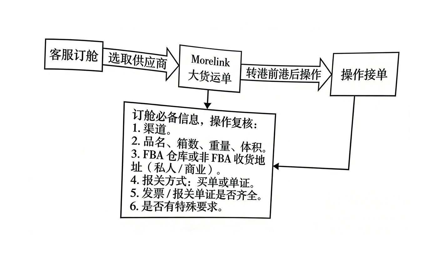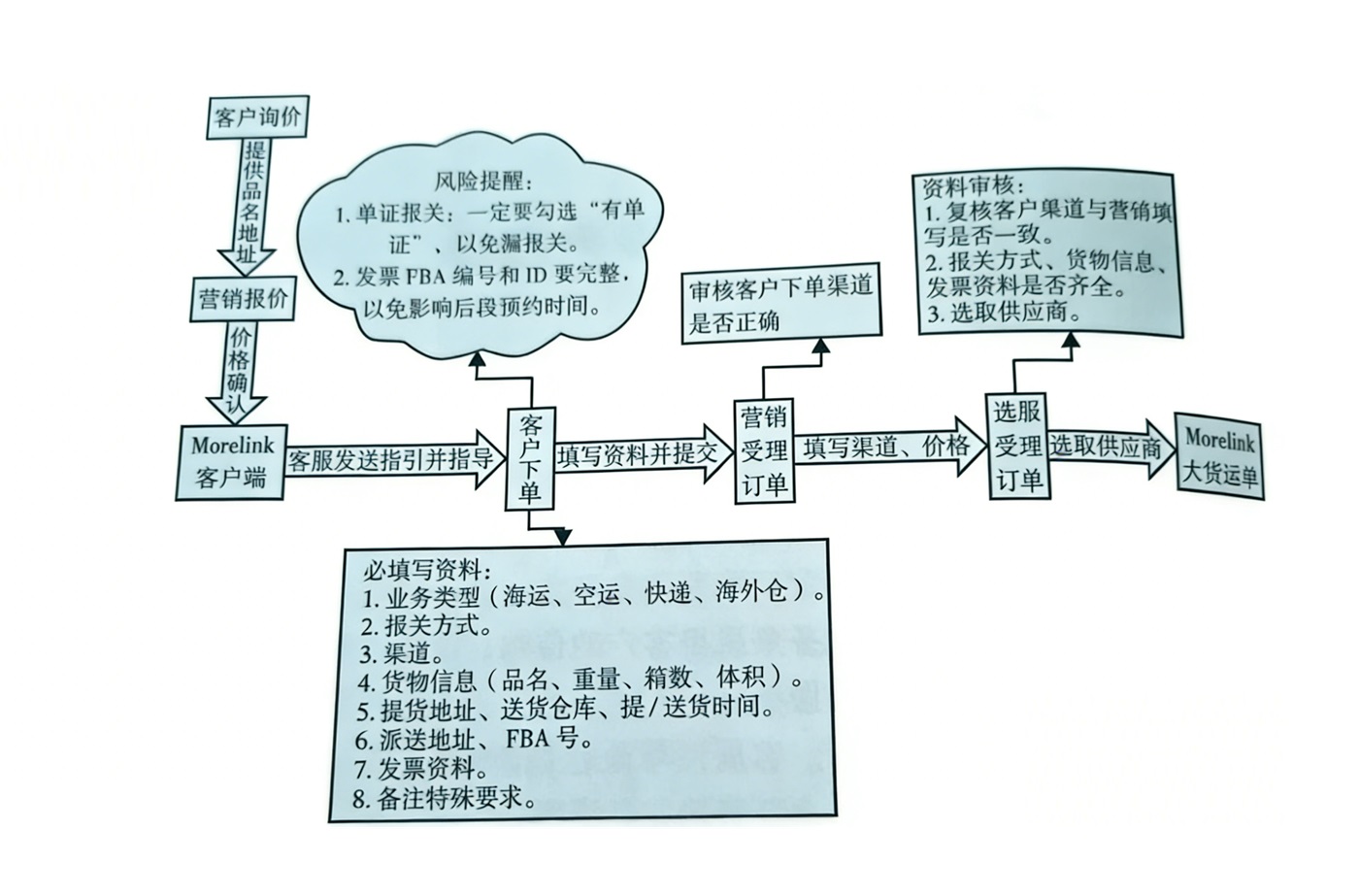 客户信息(公司名、地址、电话及联系人)、船公司、柜型、渠道、货物信息(品名、箱数、重量、体积)、装柜时间、目的地清关保证金(进口商是某物流还是客人)、目的地派送地址及价格成本、报关方式(买单或单证报关)。