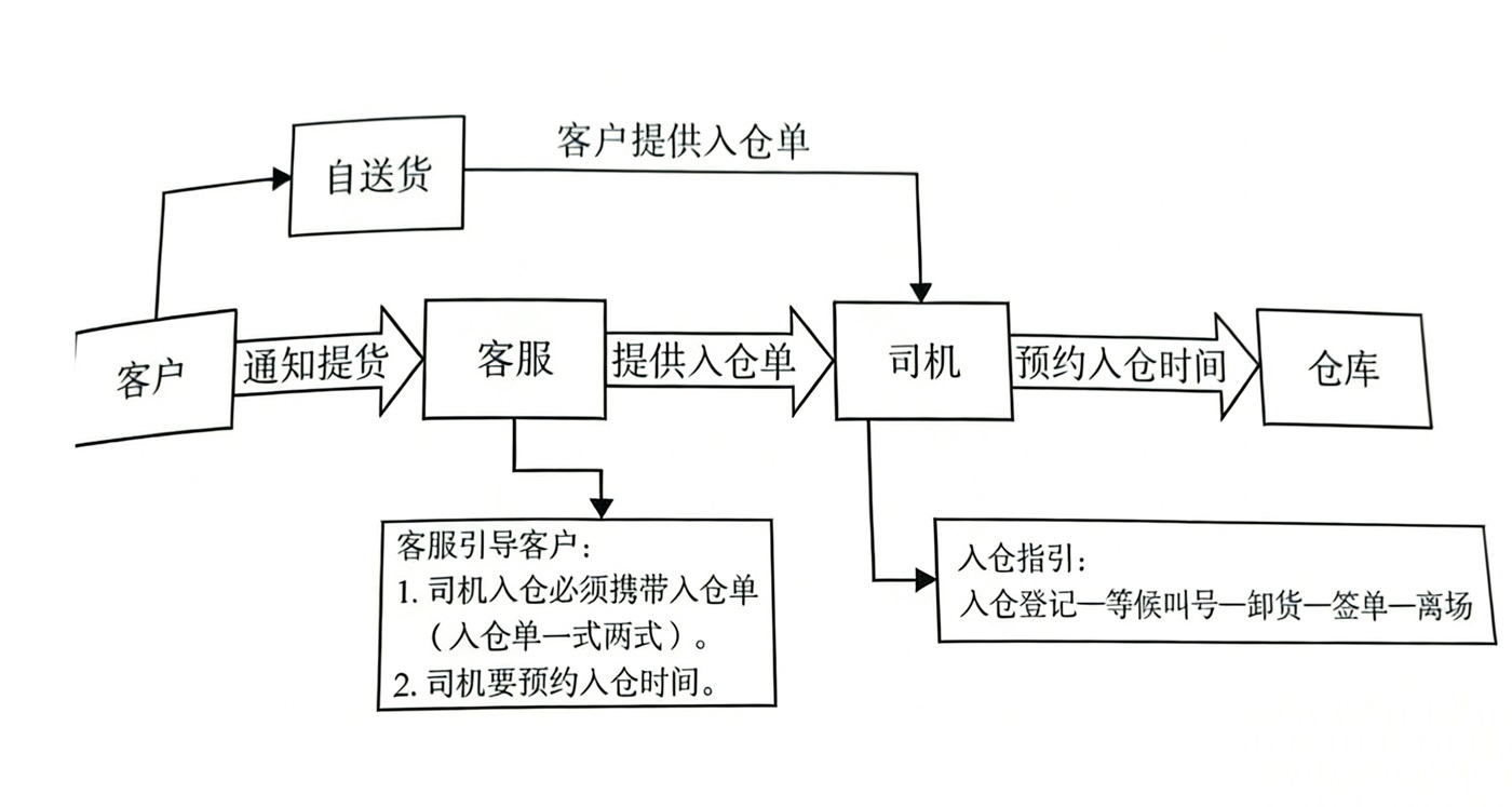 (1)客户下单,客服引导客户下载入仓单给司机;也可由客服下载后提供给司机(入仓单需一式两份),要求司机在客户处装货后预约入仓时间,并跟进货物入仓情况。