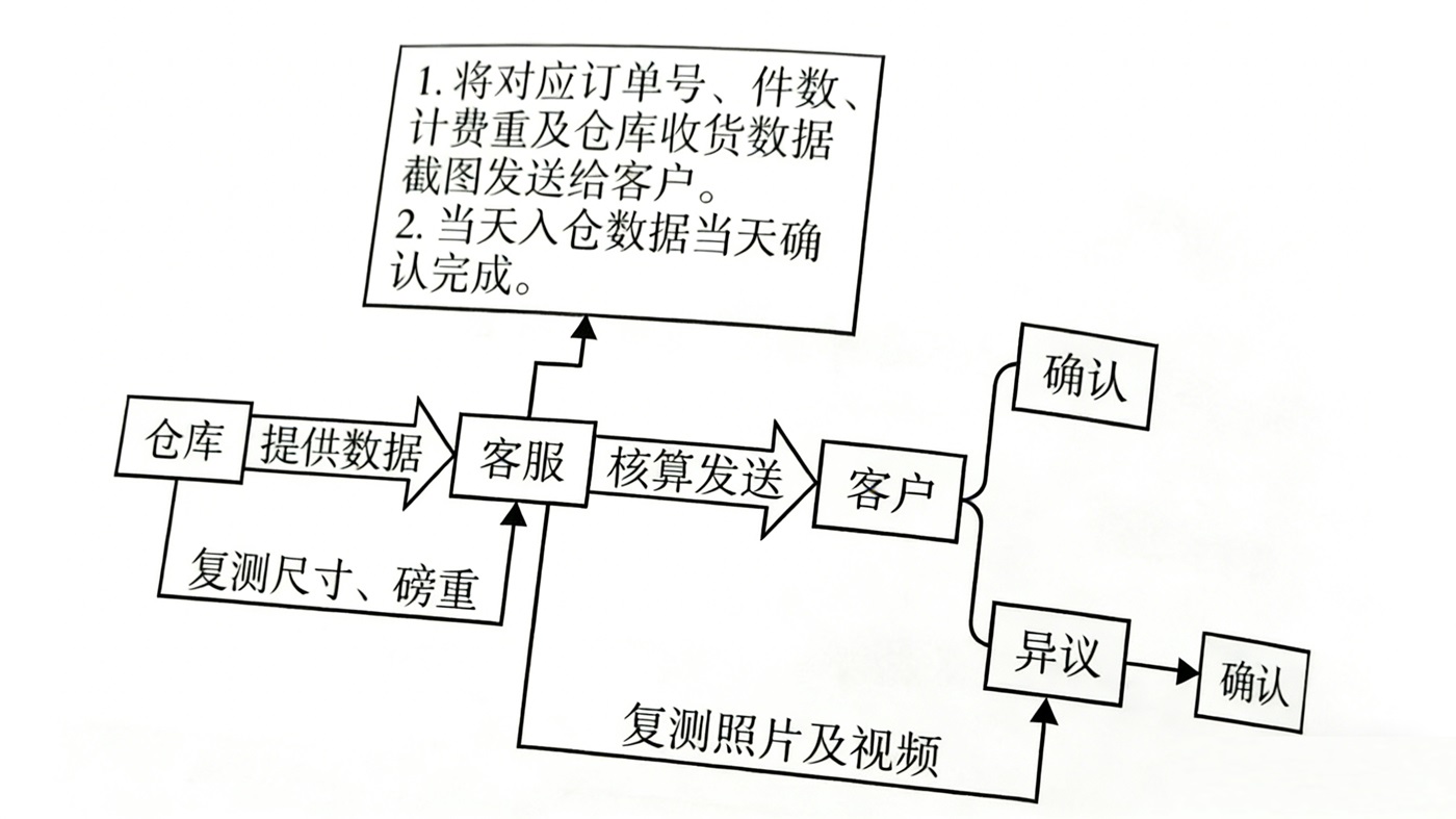 客服根据仓库收货数据,核算出计费重,然后将对应订单号、件数、计费重及仓库收货数据截图发送给客户确认。