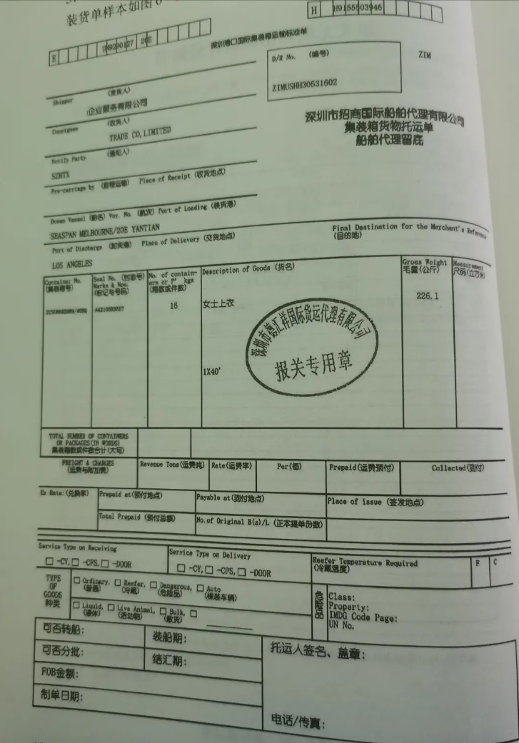 货物向海关申报出口放行后,报关行回传报关底单、放行通知书和单。其中,深圳港口起运的才有装船单。