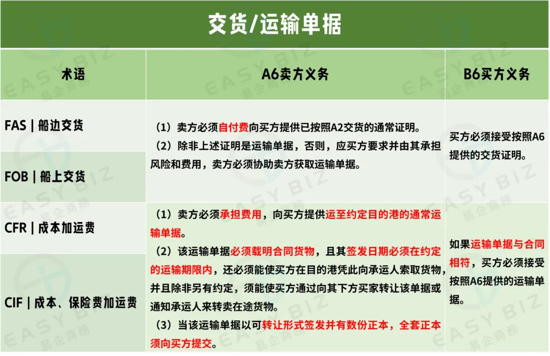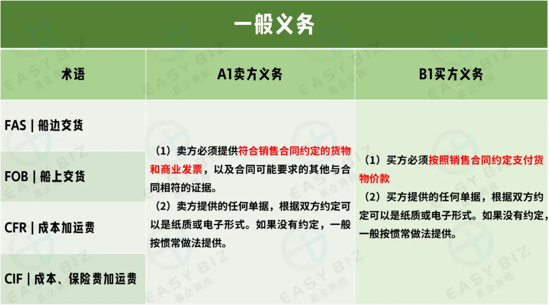 无论是前面两篇文章介绍的7个适用于任何运输方式规则术语,还是今天介绍的4个适用于海运和内河水运规则。买卖双方最最基础的“一般任务”条款,那就是卖方按时按要求交货、提供相应的单据;而买方也需要按时按约定支付价格、提供相应单据。这是最简单也是最重要的一个条款,因为一单买卖最重要的就是卖家收到货款,买家买到符合要求的产品。
