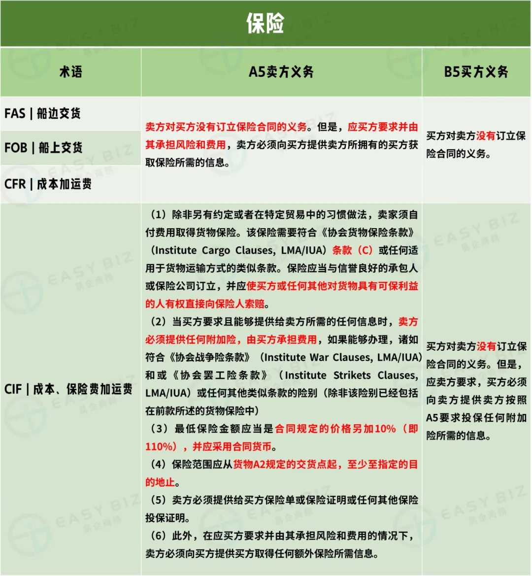 在“保险”条款下,FAS、FOB与CFR三个术语的买卖双方义务都一样,卖方都对卖方没有订立保险合同的义务,但这三个术语规则之下买家所承担的风险相对更大,理论上一般是应买方要求购买保险,这时候保险费用跟风险就需要由买方负责。但是卖方也需要为买方提供购买保险时所需要的相关信息。