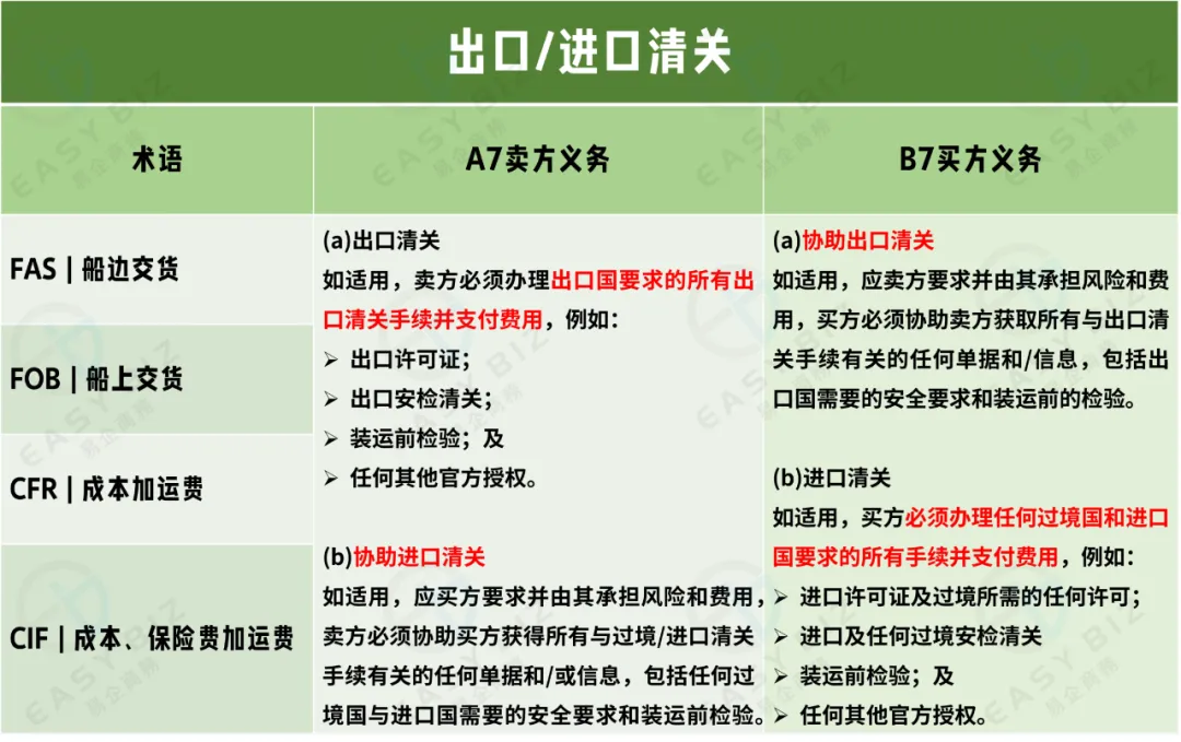 在“出口/进口清关”这一条款中,4个适用于海运和内河水运规则对买卖双方的义务划定就比7个适用于任何运输方式规则要更加简单清晰。4个术语:FAS、FOB、CFR与CIF他们买卖双方的义务都是一样的,卖方承担出口清关的义务以及相应费用,而货物进口清关或者经由第三国国境清关、支付任何进口关税或者办理任何进口海关手续都由买家承担。