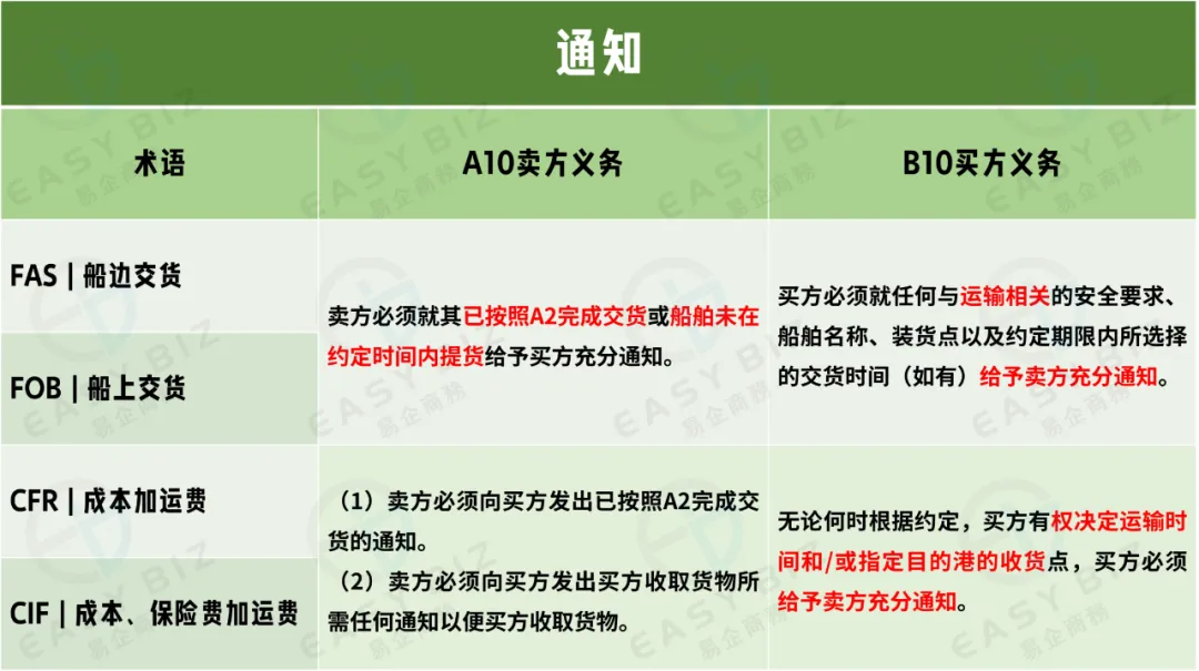 来到最后一个“通知”条款,作为卖方在按照A2完成交货后,必须都要向买方发出为买方提取货物所需的任何通知。FAS与FOB条款中,当卖方遇到船舶未在约定时间内提货的情况时,也有义务给予买方充分的通知。