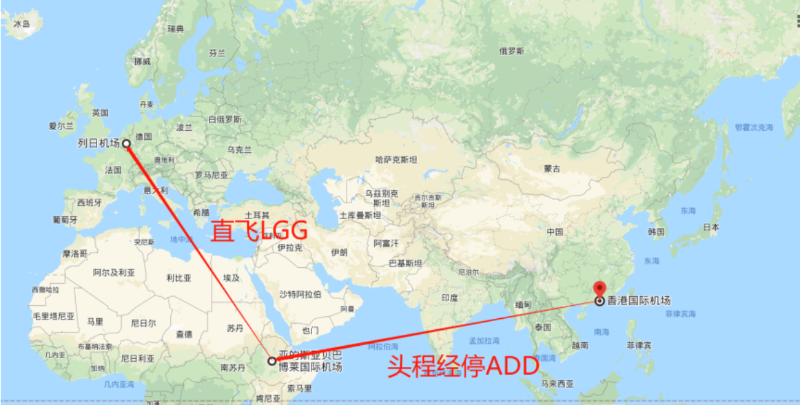 实际案例:埃塞俄比亚航空ET去年在香港除了有一条直飞的航线,其实还有一条经停的航线,这条线在名义上是从香港直飞比利时的航班,但其实途中会经停一下埃塞俄比亚的首都亚的斯亚贝巴的博莱机场ADD,这里也是埃塞俄比亚航空ET的中转枢纽机场,在这里卸下部分货物后,再从ADD飞往LGG,由于途中只是逗留2-3小时,因此从时效上仍然算是直飞的航班。 航线如下图所示: