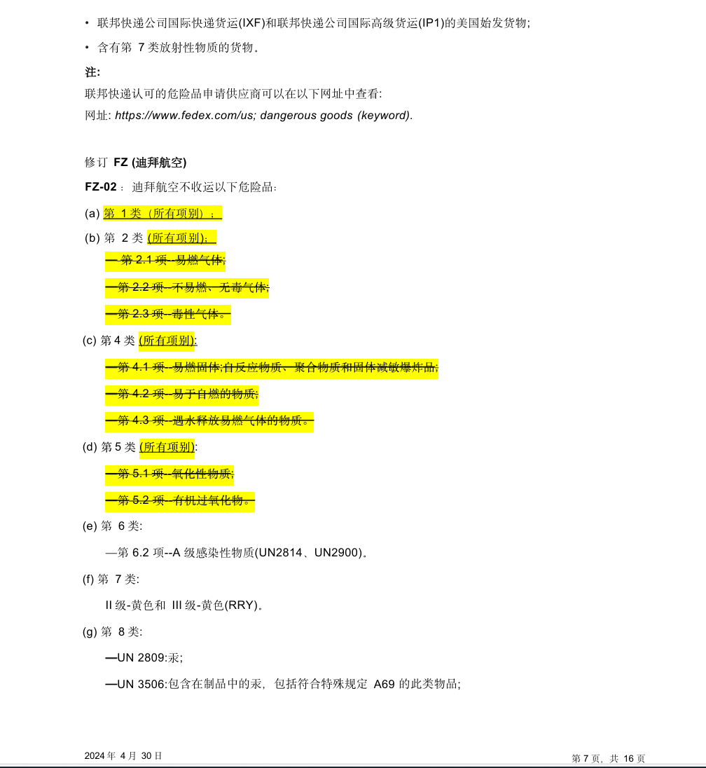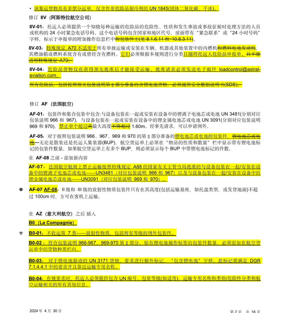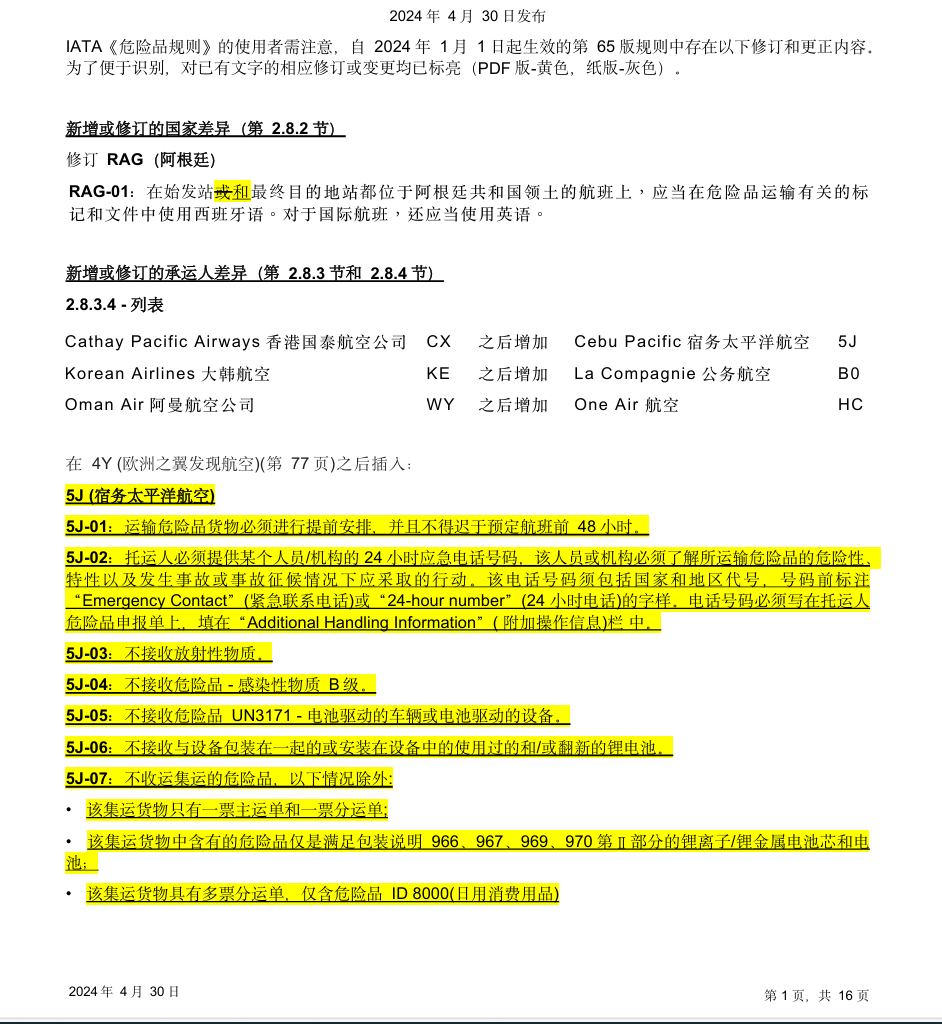 IATA《危险品规则》的使用者需注意,自 2024年 1月 1日起生效的第 65版规则中存在以下修订和更正内容。 为了便于识别,对已有文字的相应修订或变更均已标亮。