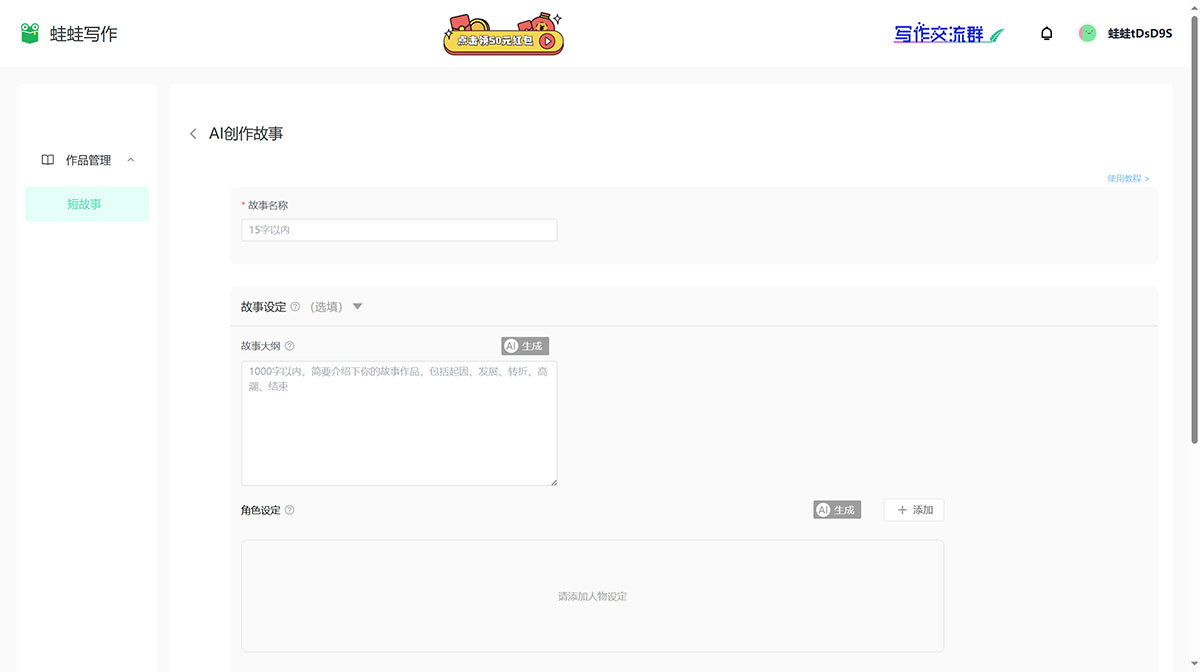 点击【新建短故事】或【立即AI创作】,进入【AI创作故事】页面