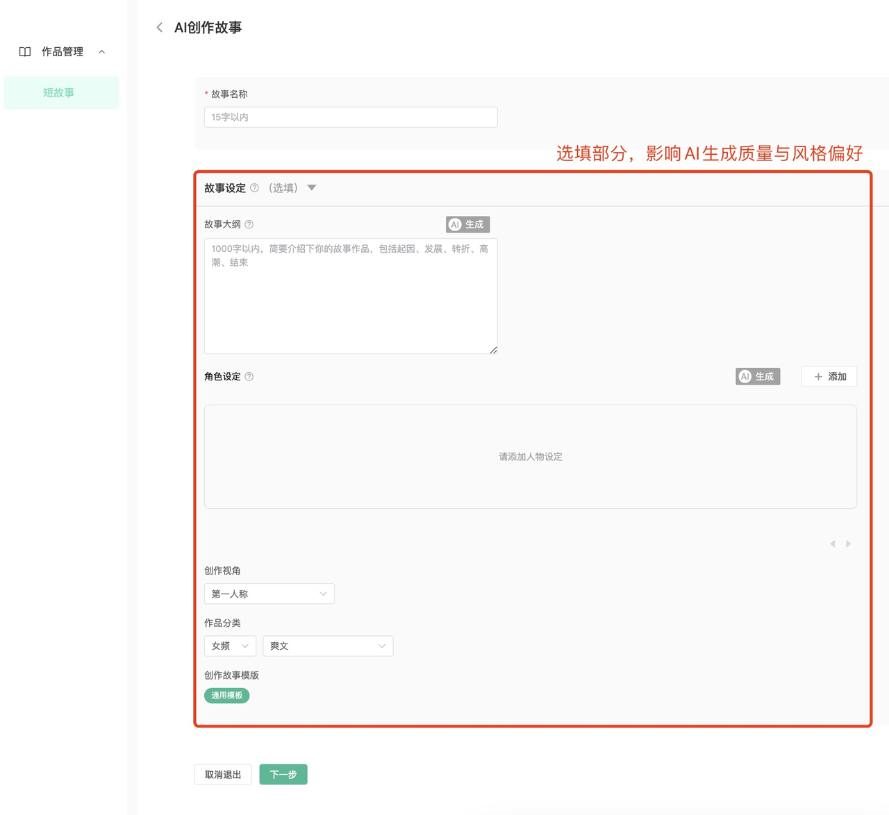 2、故事设定:选填,可收起(丰富AI创作的偏好设定)