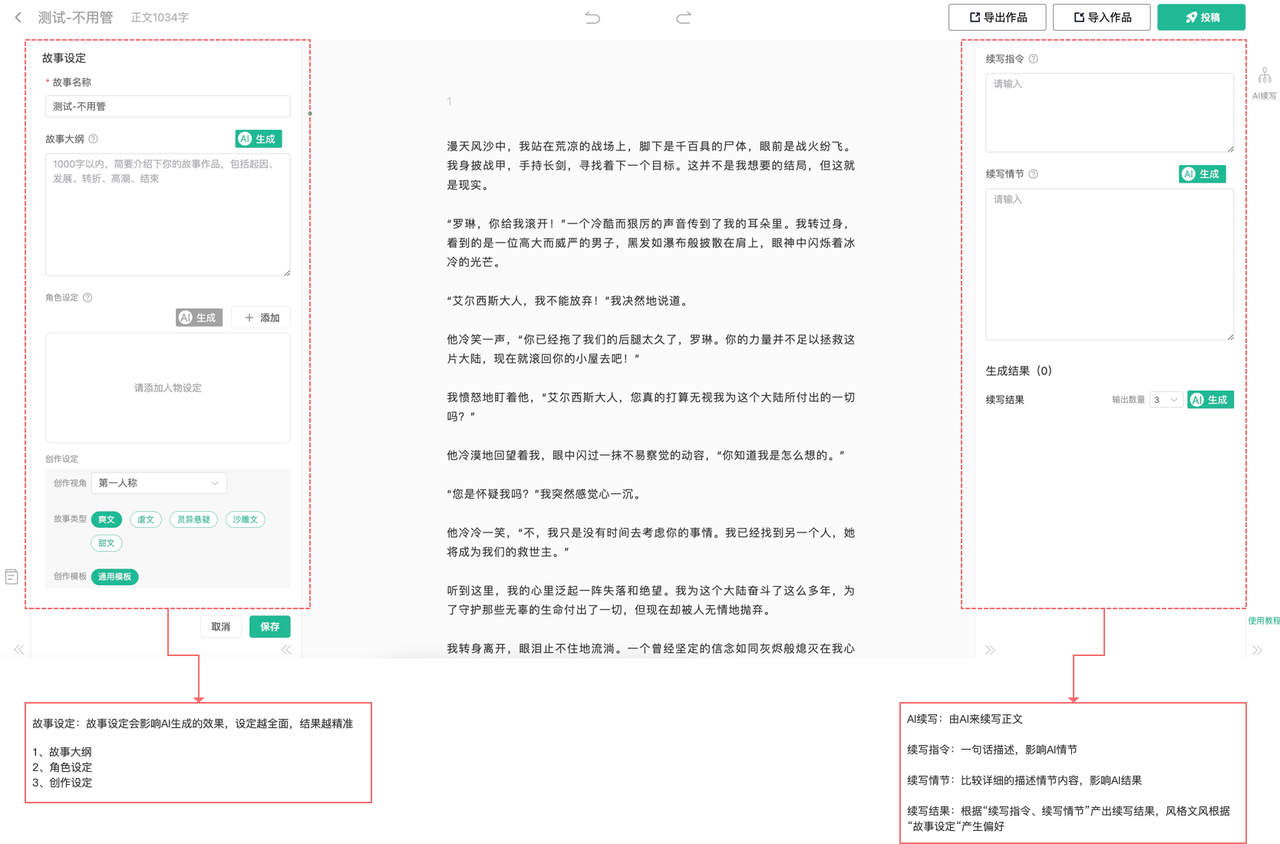 – 续写结果:根据“续写指令、续写情节”产出续写结果,风格文风根据“故事设定“产生偏好