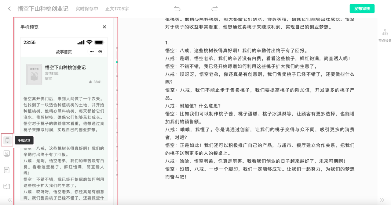 点击【手机预览】后出现模拟手机上的效果预览,且文本编辑区和预览区实时联动。